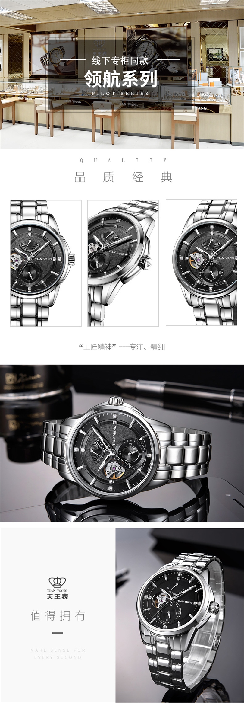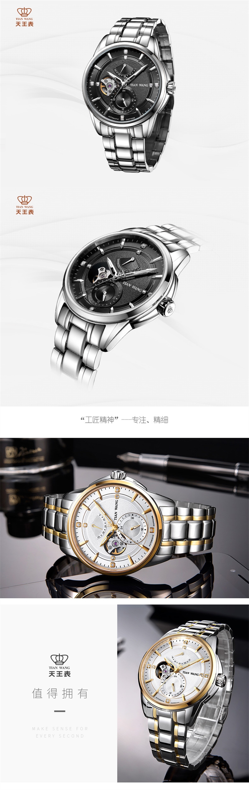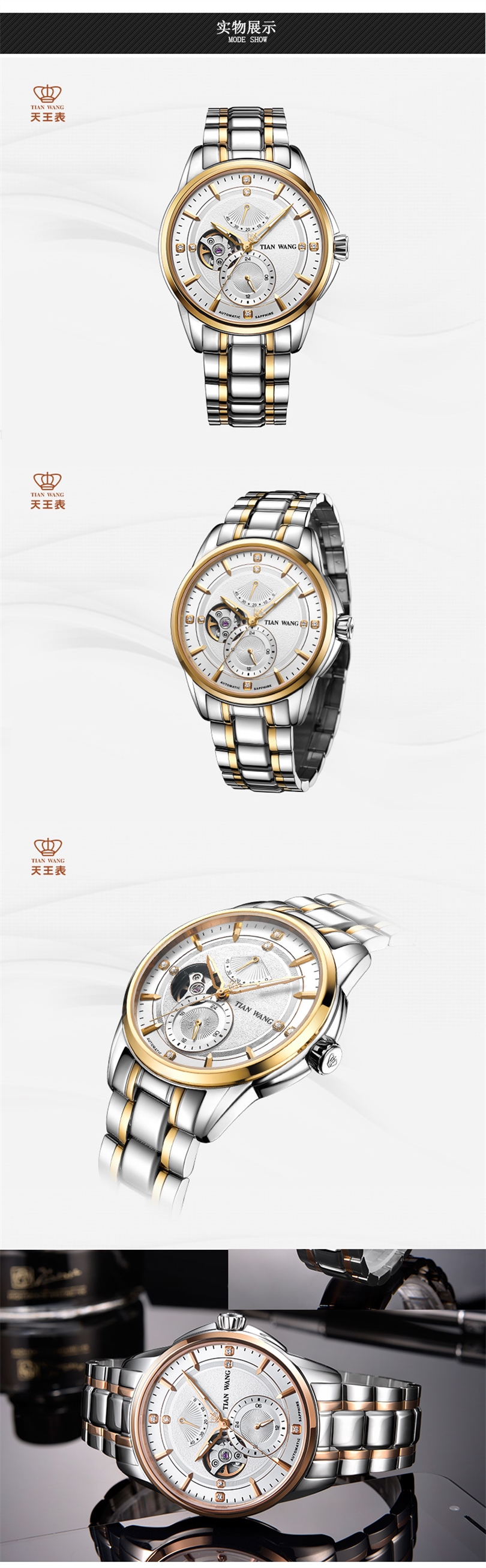 天王表(TIANWANG)手表 领航系列男士机械商务休闲手表5967 白盘间金