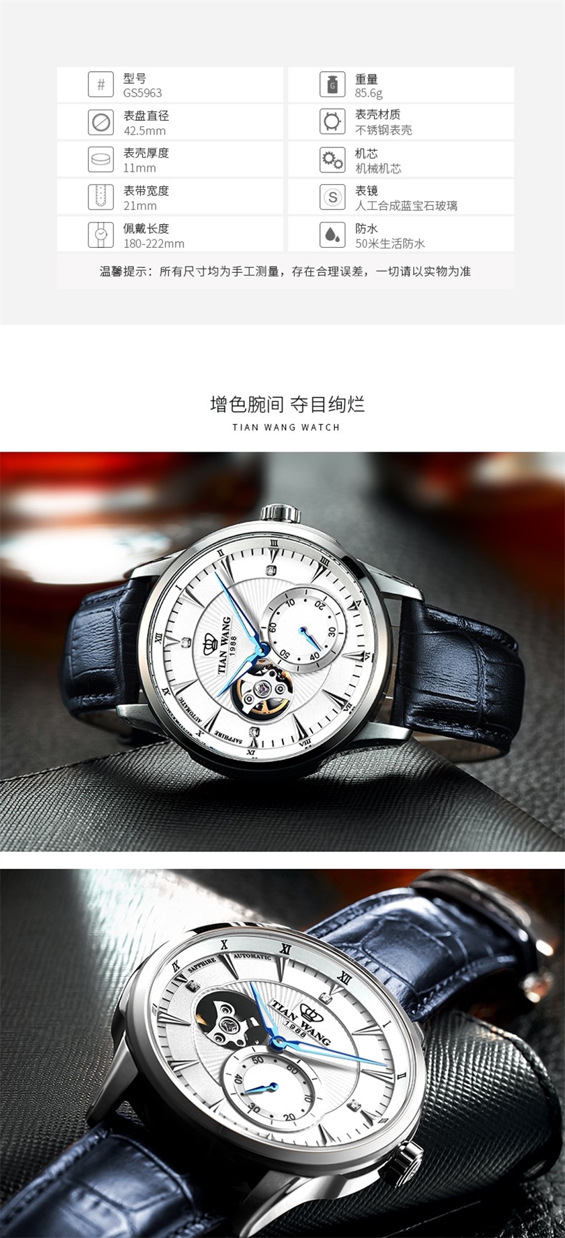 天王表(TIANWANG)手表 轮时代系列男士商务休闲皮带机械腕表5963 黑盘黑色皮带